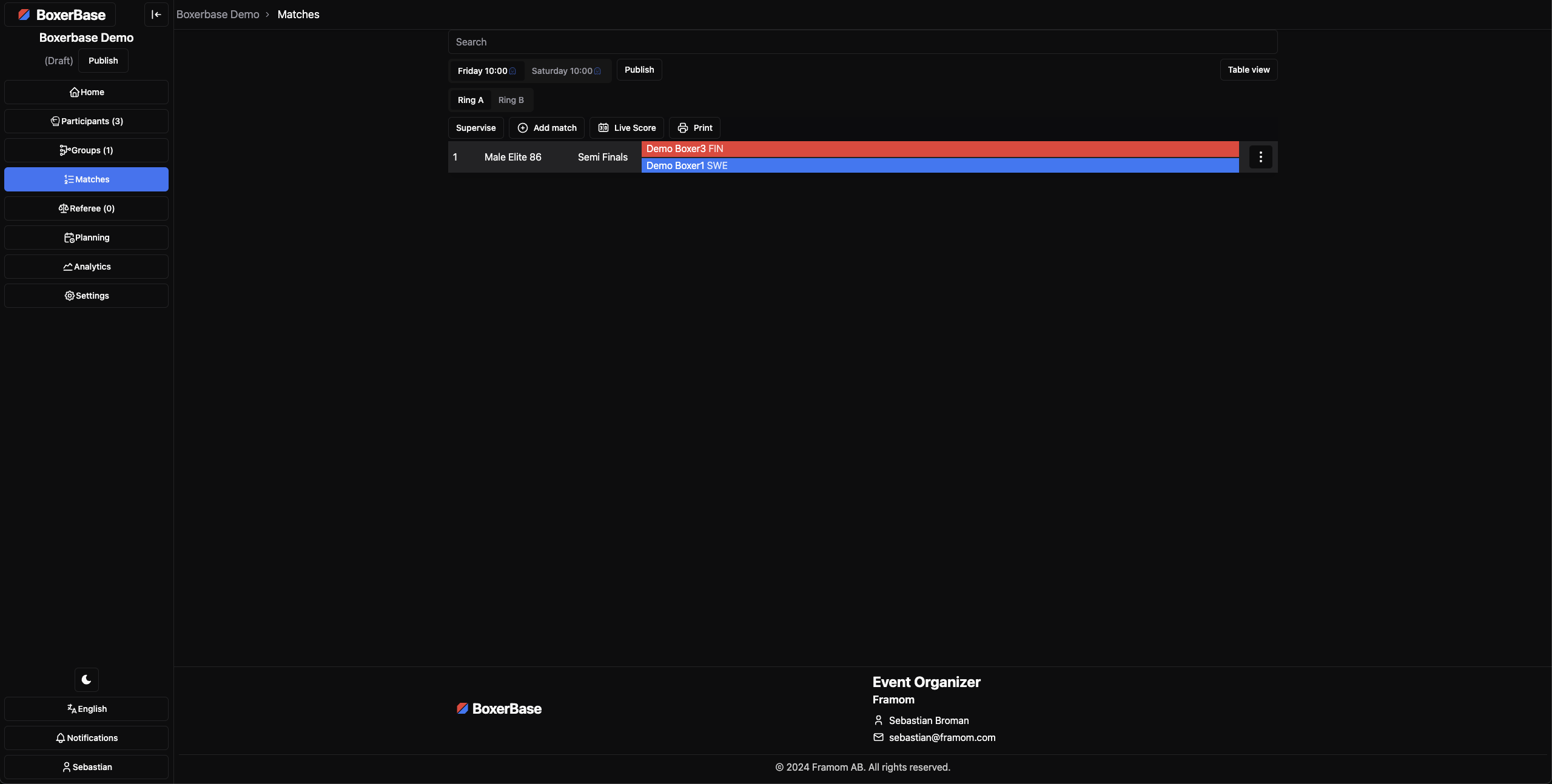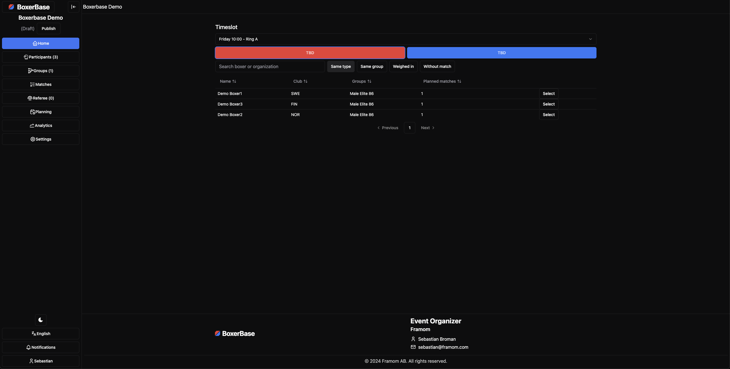 Pressing the add match button will take you to the matchcreator. From here you can schedule additional matches. You will need to select the first boxer and then it should switch to select the second boxer. There are some filters to help you find a suitable opponent. “Same type” meaning someone in the same category but another weight and “same group” meaning the exact same category and weight. There are also filters to find only the ones that have weighed in or has no planned matches yet. Newly created matches will be placed at the bottom of the list.