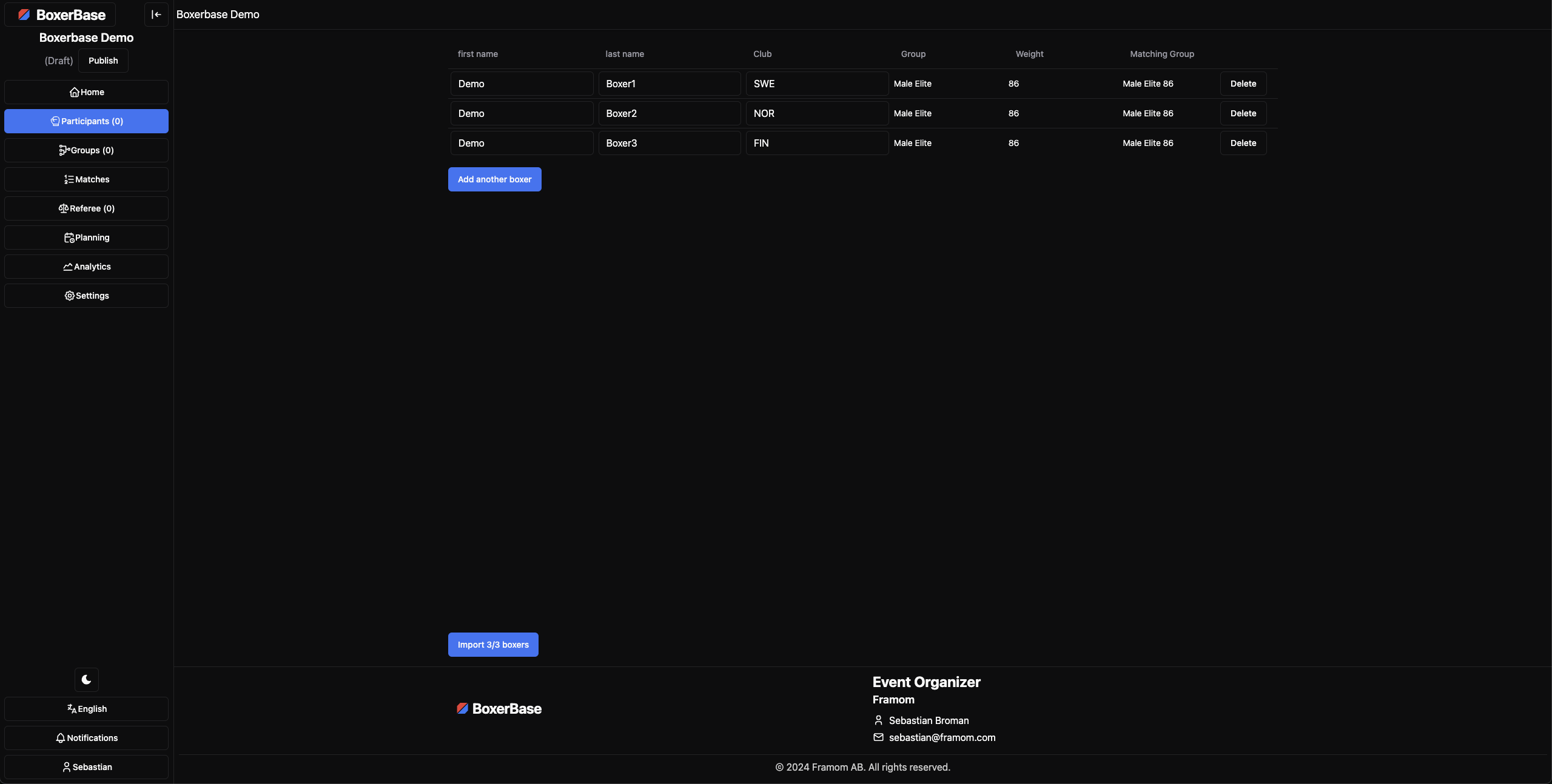 There are 2 ways to enter boxers, either via the “Add boxer” button where you can add boxers from clubs you can manage in the system, or via the “Add unlisted boxers” button where you can register boxers that are not in the system. Some competitions require that all boxers are registered in the system, therefore the “Add unlisted boxers” might not be available for all events.