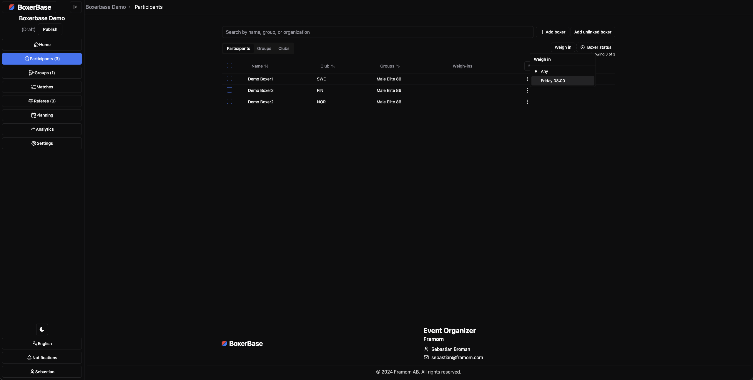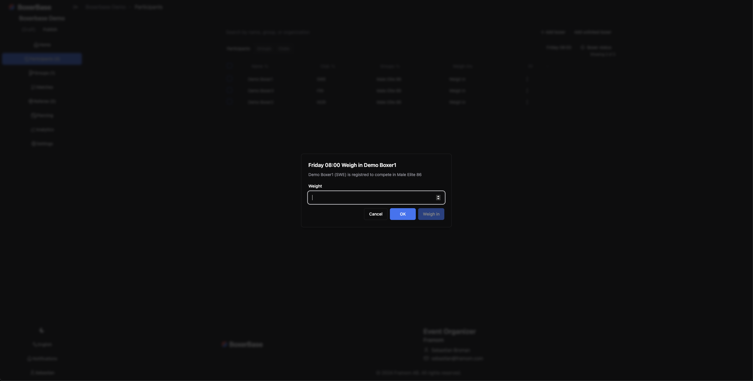 To weigh in boxers you must first select which day the boxer will weigh in. You can do this by clicking the “Weigh-in” button up in the right corner and selecting a weigh-in. This will add a weigh-in button to each boxers or display their weight if they have already weighed in. Clicking the weigh-in button will open a form where you can enter the boxers weight.