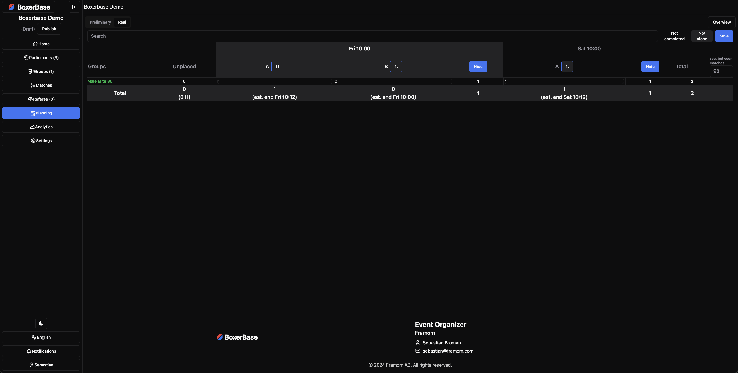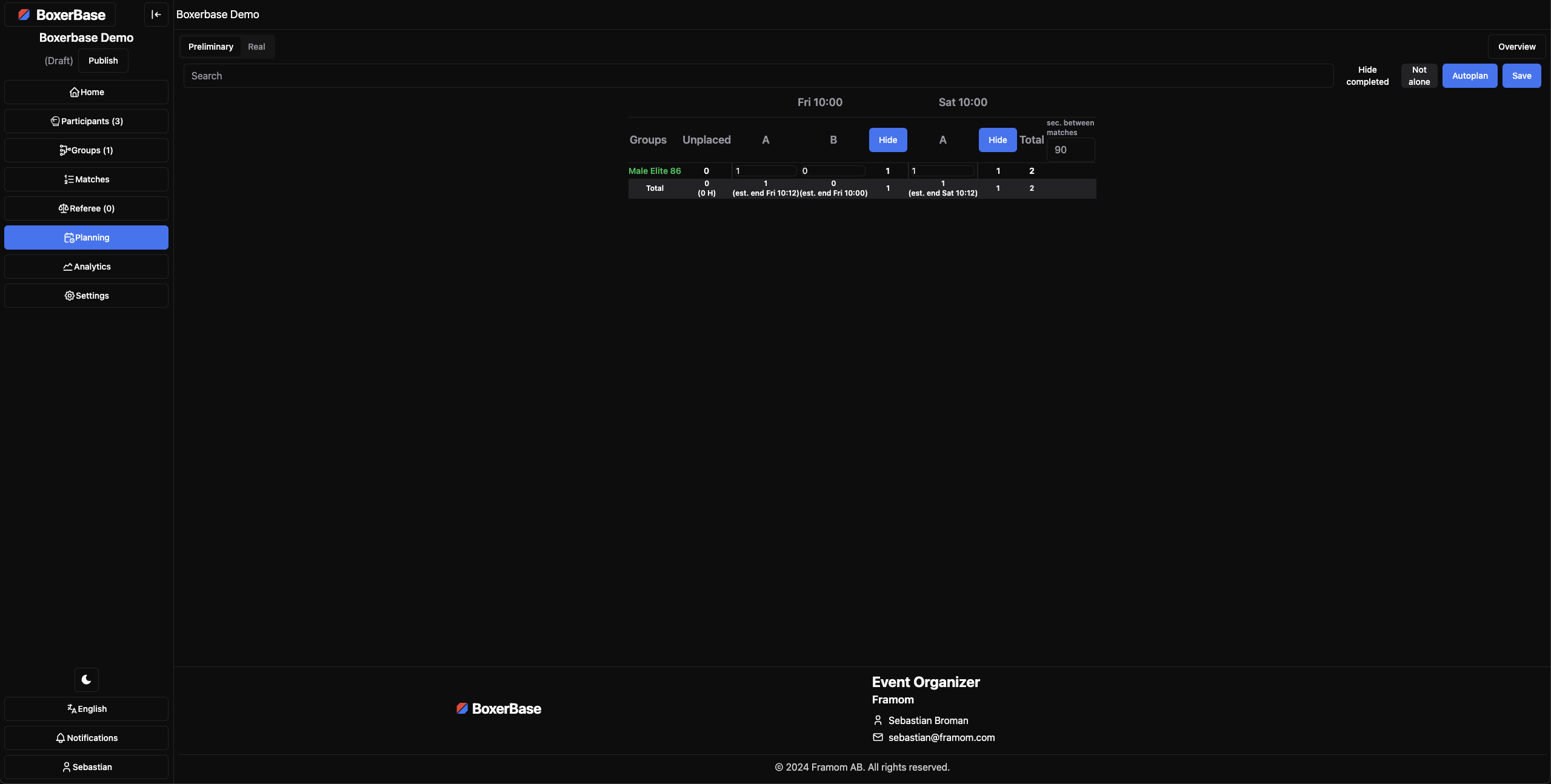 The preliminary planning page is used to create the preliminary plan for the event. This will use the unweighedin count of boxers to where you can prepare and create a preliminary schedule for the event. This is useful to estimate how many rings / how long the event will be. There is also a autoplan button that tries to split the groups evenly across all rings / timeslots, placing the finals on the last day, and the semifinals on the day before that etc.