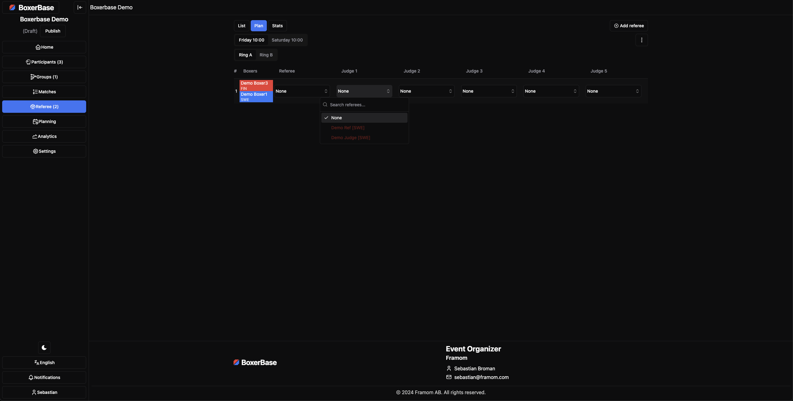 In the plan tab, you can assign referees to matches. This will let you select each timeslot / ring and then see the list of matches. Here you can assign referees to each match. They will show up as red if they are the same organization as the boxer. This is to help you avoid having the same organization judge their own boxers.